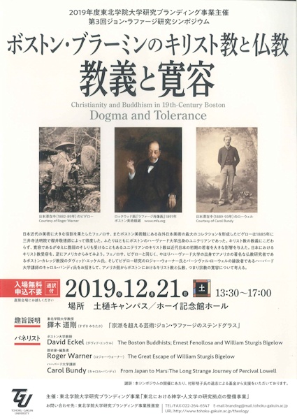 フェノロサ、ビゲローと同じく、やはりハーヴァード大学出身でアメリカの著名な仏教研究者であるボストン・カレッジ教授のダヴィッド・エッケル氏、そしてビゲロー研究のロジャー・ウォーナー氏とバーシヴァル・ローウェルの縁故者であるハーバード大学講師のキャロル・ハンディ氏をお招きして、アメリカ側からボストンにおけるキリスト教と仏教、つまり宗教の寛容について考える。