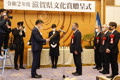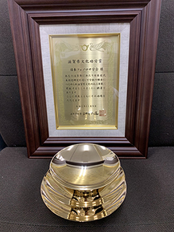 ● 2020-11-09 2020年11月9日、令和2年度滋賀県文化賞贈呈式が行われ、日本フェノロサ学会は「滋賀県文化功労賞」を受賞しました。 会長の岡部昌幸先生(帝京大学教授)とともにに、新関も事務局長として式に参列しました。三日月知事より立派な表彰額と金杯を頂きました。感激です。 これも、偏に学会を維持されてきた、諸先輩方のお陰と感謝しております。 (報告:新関伸也先生) 表彰式の様子 三日月知事より表彰を受ける岡部会長 盾と金杯
